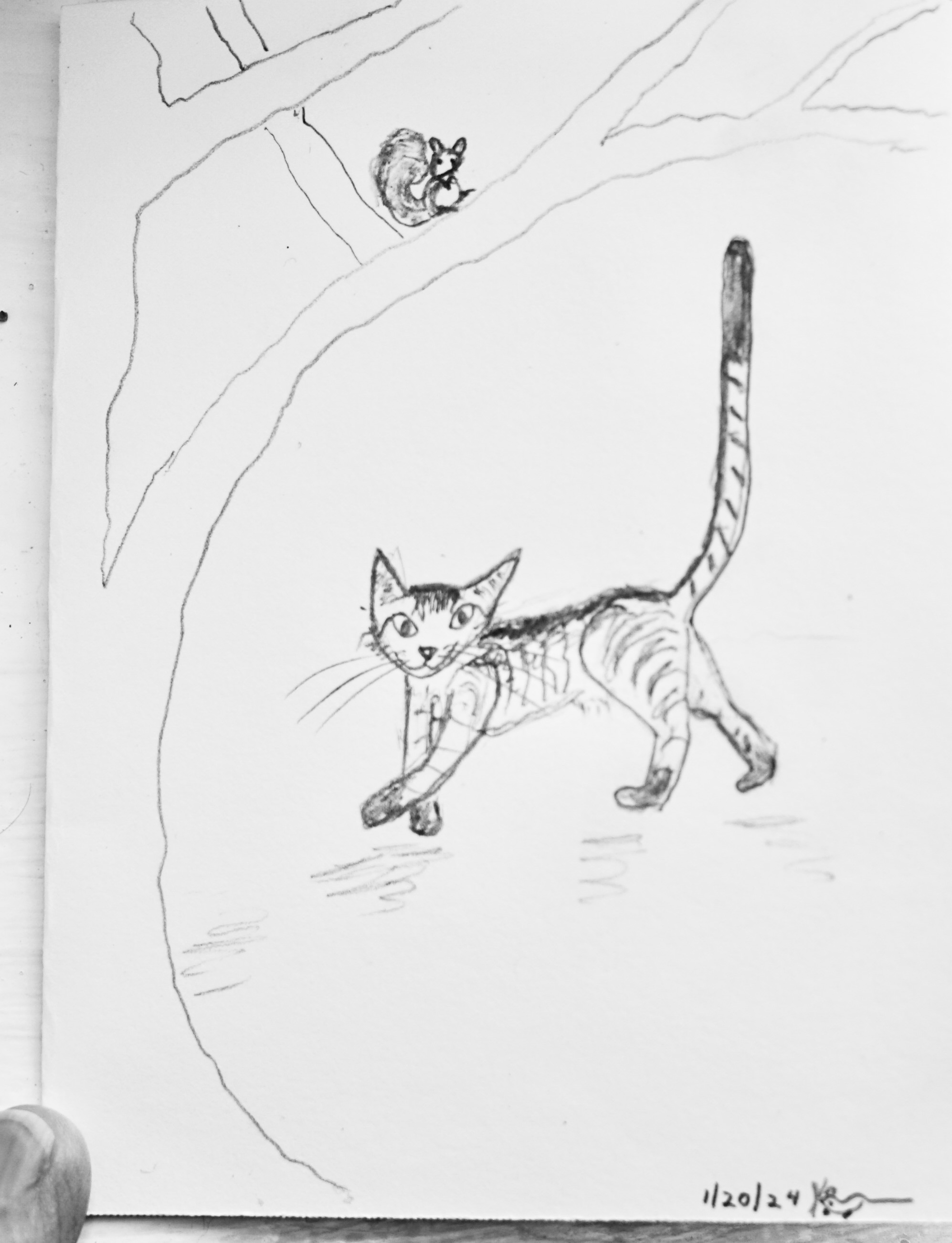 This summer I’ve been sketching my cat at least once a day. Sometimes I sketch the friendly squirrels of Baltimore too. (They are especially friendly if I have nuts.) The sketches prime my creative pump and get me started for the rest of the day, no matter if I paint or write, or both!