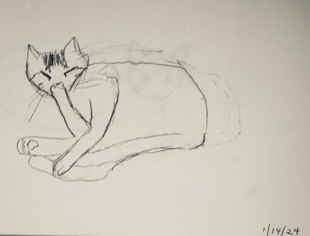 I’ve been drawing my cat Nekko at least once daily for a month now. Why? She’s cute (of course! She’s a cat!) and I enjoy drawing people and things that I love. She is definitely people I love and of course, she’s cute. (Did I mention Nekko is my cat?) Here’s the latest of her sleeping on the Bmore Art magazine I was trying to read.