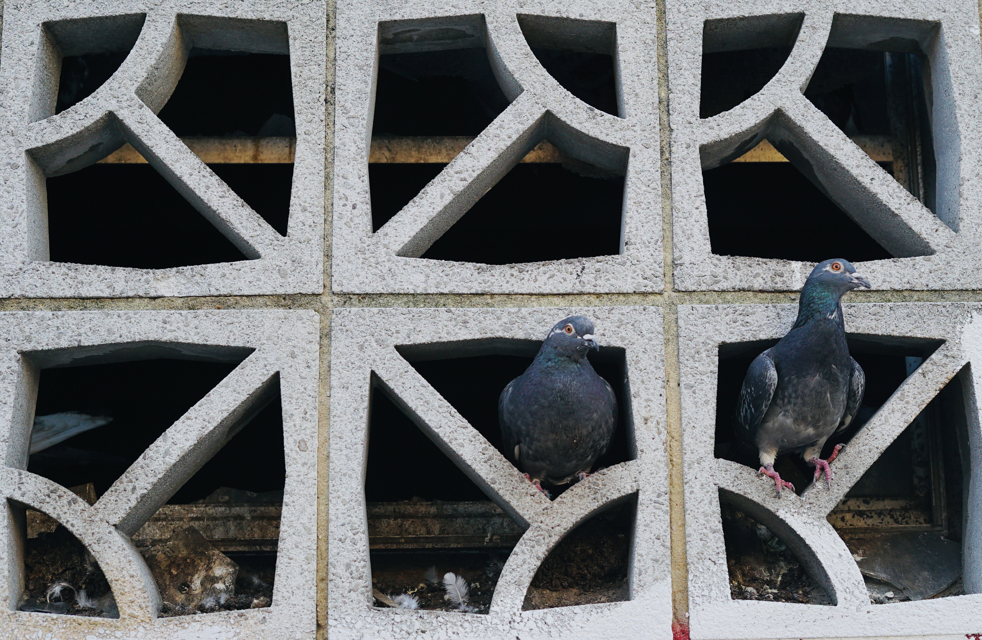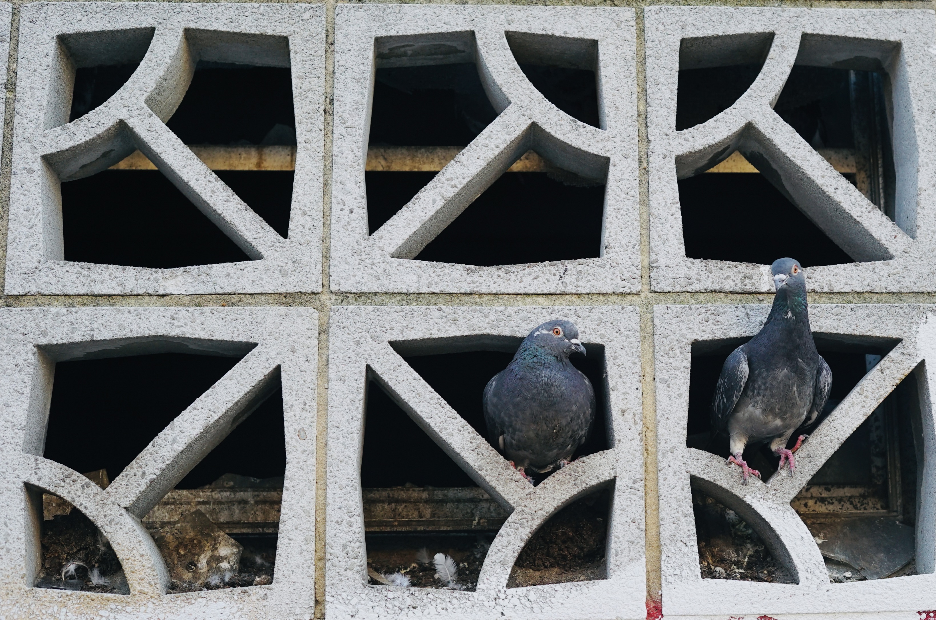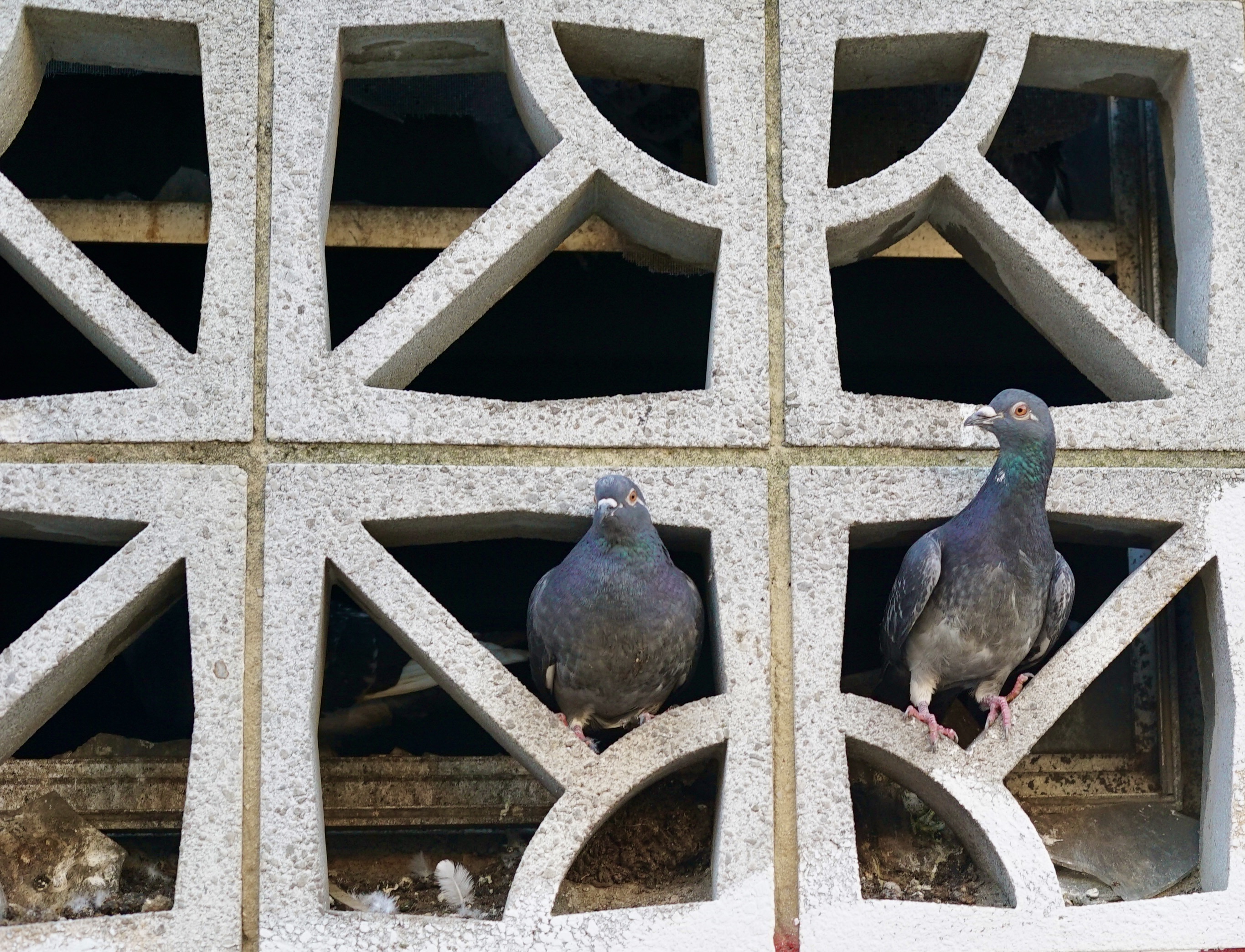 I’m an urban naturalist. That means that I love my city (Baltimore) and enjoy wandering around looking at its denizens-pigeons, squirrels, sparrows, starlings, seagulls, and the occasional cardinal and junco ( a sparrow size bird with white belly and black head). There is a pigeon roost near me-an abandoned building with concrete bricks that the pigeons adore. Here’s some pictures!