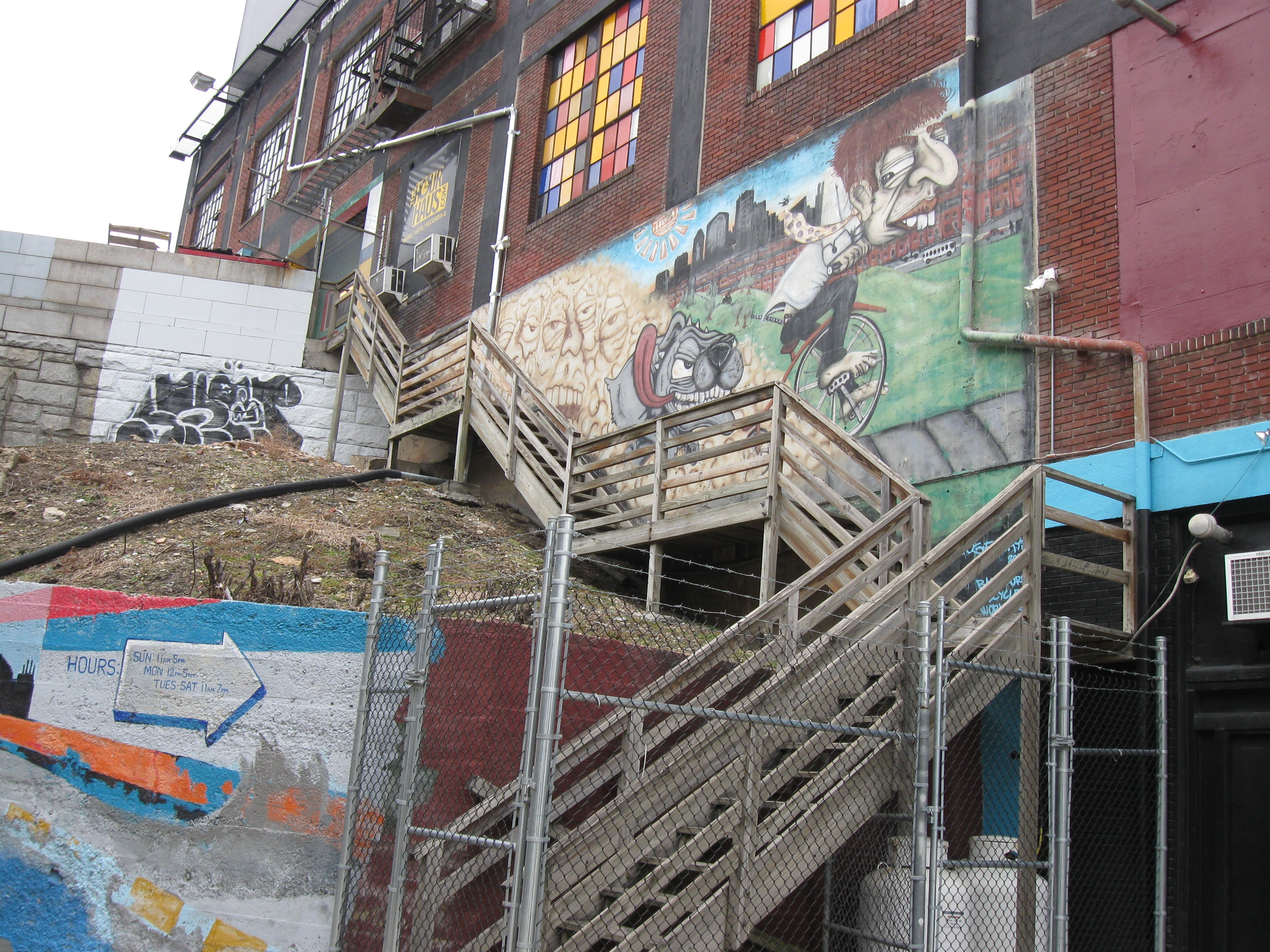 The mural below has a bicycle shop below it.